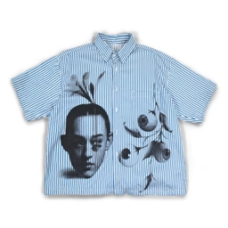 Short sleeve shirt with button closure and striped pattern. Features artwork detail on the front panel with chest pocket.