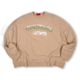 Crewneck sweatshirt made from baby terry fabric. Features front “THANKSINSOMNIA” plastisol screen print with paint splatter effect. Designed for daily wear and layering. Finished with ribbed collar, cuffs, and hem.