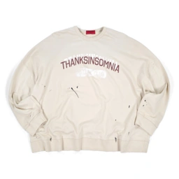 Crewneck sweatshirt made from baby terry fabric. Features front “THANKSINSOMNIA” plastisol screen print with paint splatter effect. Designed for daily wear and layering. Finished with ribbed collar, cuffs, and hem.