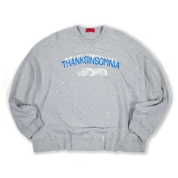 Crewneck sweatshirt made from baby terry fabric. Features front “THANKSINSOMNIA” plastisol screen print with paint splatter effect. Designed for daily wear and layering. Finished with ribbed collar, cuffs, and hem. Material: Baby Terry