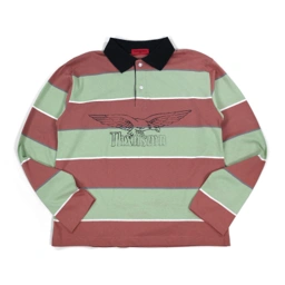 Long sleeve polo shirt made from cotton fabric. Features horizontal stripe pattern in muted red and green tones. Finished with a contrasting black collar and button placket. Includes front graphic detail.