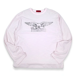 Long sleeve t-shirt with washed finish and front graphic print. Features rib collar and contrast neckline.